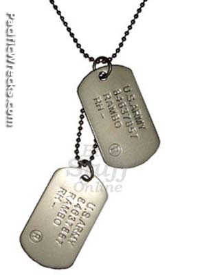 Name, SSN, blood type, religion And then there's two of them! One for your neck, one on a boot. In case they can't find your head They still can ID you.