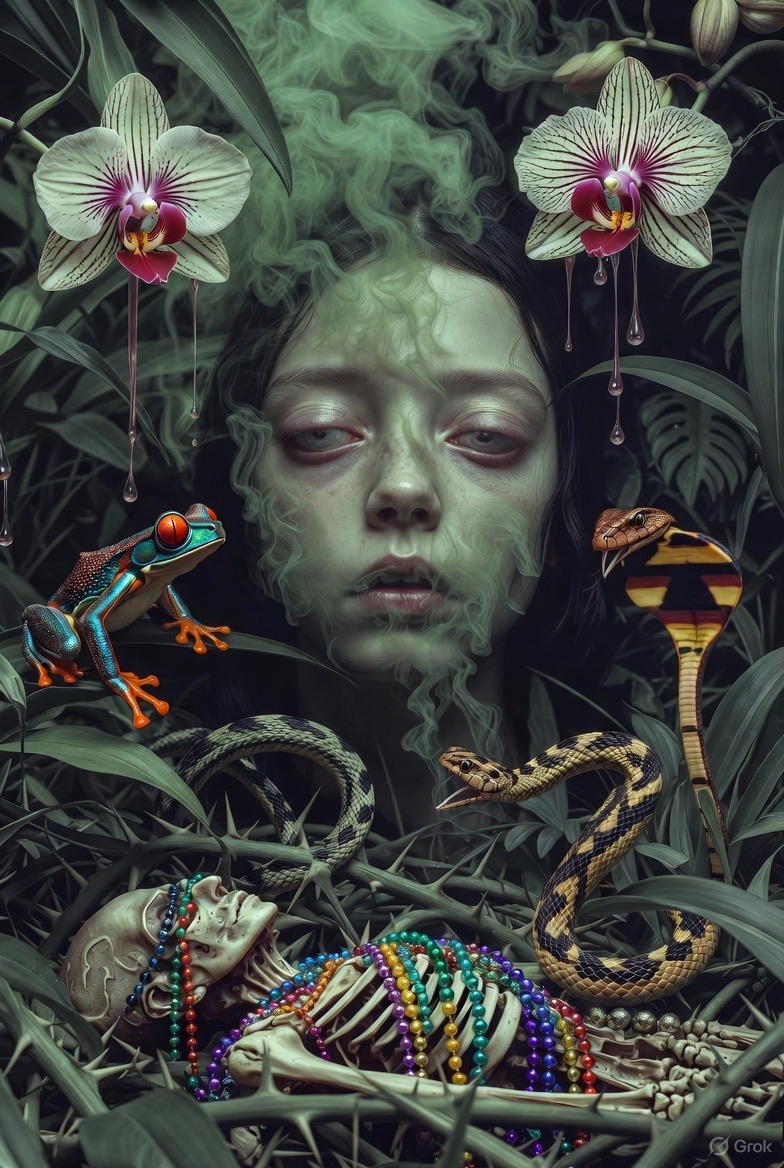as I traverse the jungle’s mossy ways. The eternal source of summer, I feel scents of orchids and hibiscus bleeding into moist air. Opiate-eyed, I marvel at the poison frogs, Iridescent, red and blue, startling, jewels I don’t dare wear fer-de-lance,eyelash viper One misstep…. Here in the underworld of shade death sports brilliant colors. a Mardi Gras of contradictions, peaceful, alive. Corpses bloom. So easy to let go, to be lulled into misadventure. No absolutes. only graceful curves disappearing into tangled thorns A sacred maze where I could meander forever my own dome of pleasure. Somewhere in these depths Blood Woman fills her net with corn while a cross-eyed princess Reaches for my heart burn. I am scented smoke, a pleasing offering to ancient nostrils. I float along wisp, deeper into the gloom. Soon something will inhale me, and the offering will be complete. © 2025 Dale Pavolko |