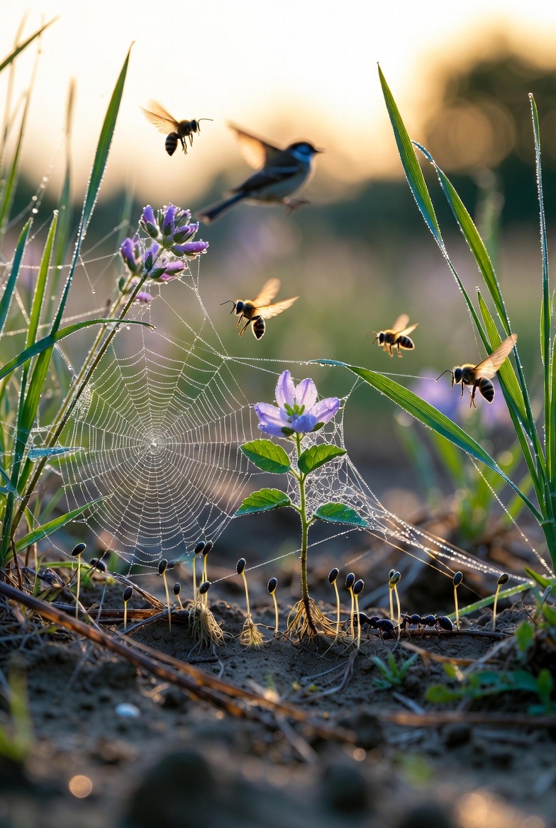 That beads each blade of grass in fragile light, The humble spider’s web, so finely drew, Where silver threads catch dawn’s first gentle sight; To think of tiny seeds that split the soil, Of roots that seek the dark in patient grace, Of leaves that turn to sun through summer’s toil, And flowers that open in their appointed place; To think of ants in orderly array, Of bees that hum their gold from bloom to bloom, Of sparrows flitting light from spray to spray~ All woven in creation’s patient loom; In these small works, unnoticed by the proud, God’s glory shines the clearest and most loud. © 2025 Dale PavolkoReviews