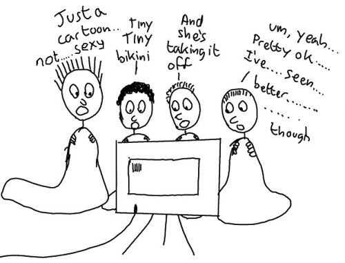 As with Mike, he had been saying that they were ONLY CARTOONS and they couldn’t be sexy. Thing is, when it started, his face changed and he very much looked like he didn’t know how he should be feeling.