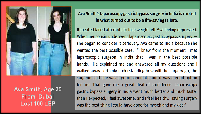 Repeated failed attempts to lose weight left Ava feeling depressed. When her cousin underwent laparoscopic gastric bypass surgery "she began to consider it seriously. Ava came to India because she wanted the best possible care. “I knew from the moment I met a laparoscopic surgeon in India that I was in the best possible hands. He explained to me and answered all my questions and I walked away certainly understanding how will the surgery go, the surgeon said she was a good candidate and it was a good option for her. That gave me a great deal of confidence. Laparoscopy gastric bypass surgery in India went much better and much faster than I expected, I feel awesome, and I feel healthy. Having surgery was the best thing I could have done for myself and my kids.”