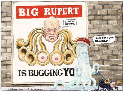 the bigger they are...A Poem by delapruchooooh when it rains, it pours---don’t it, rupey?old, rich, white & wrinkly--- the kind of guy who you would pick out of a lineup if there was an ad for a television show about to come out called “the man,” as in that proverbial cold hearted corporate tyrant who will stop at nothing to profit from the suffering of others through the hustling and outright looting of anyone in his path, well, he began chomping up newspapers like pac man in the mid-1950’s as everyone under the sun knows, and he hadn’t stopped until most recently when he got his balls caught in the door of whatever limo he was being escorted into--- as the story unfolds and we watch the old withering pac man’s best friend and associate of 52 years, mr. hinton leave the sinking ship this past friday and all the dirty birdies like the head of scotland yard are coming out of the woodwork to bail on ol’ ebenezer--- amidst the arrests of people like New of the World’s editor, ms. brooks & prime minister david cameron’s former communications director andy coulson--- others in the UK will certainly follow & as mr. cameron sounds the alarm to pull together an emergency parliamentary meeting, the FBI gears itself up to investigate murdoch’s american wing of his empire & you know what that means--- FOX NEWS, HERE COME THE PITCHFORKS & TORCHES. © 2011 delapruch |