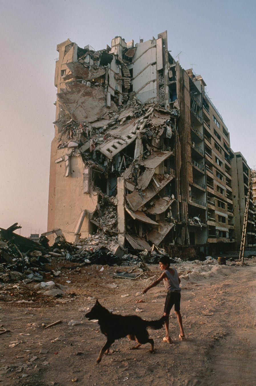 I wonder if the boy has any idea that there are places in this world where destroyed buildings aren't part of the landscape.? Surely he does. Another question is how can a photographer click away and not feel a part of the machine that furtheres this kind of violence? Maybe they think they're making a difference. Maybe they are. My final question is why didn't the dog break away and bite our photographer hero in the a*s? That's a big dog.