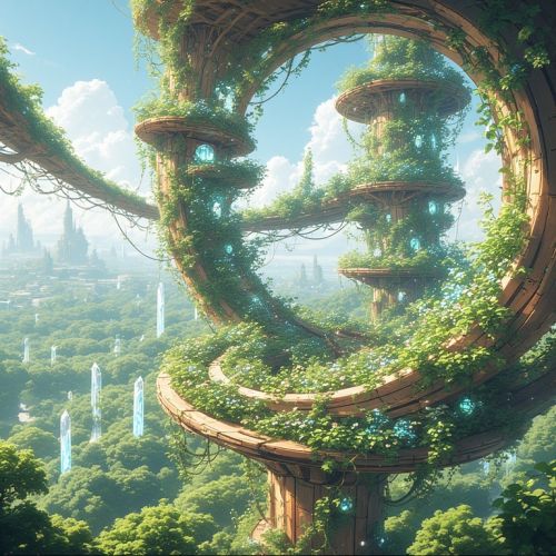 Gardens arranged in spirals upon wooden scaffolds and crystal lattice towers. Plants are interwoven with bioluminescent vines for night cultivation. Energy harvested via reflective solar leaves set between the spirals. Labor is fully communal; no fixed specialization observed.