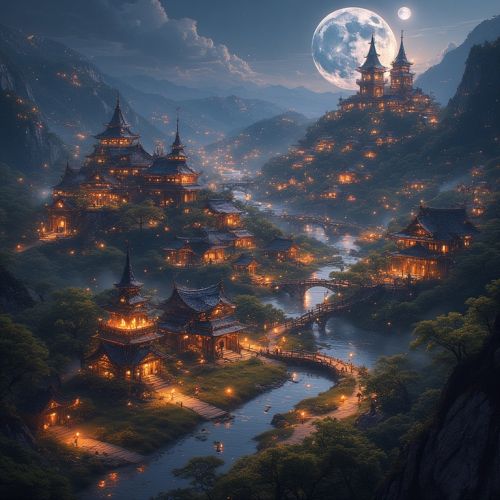 Entire plain illuminated: rivers, gardens, and festival lanterns cast layered light. Villagers navigate fields without shadow; no artificial lamps used. Atmosphere of perpetual celebration even during mundane work.
