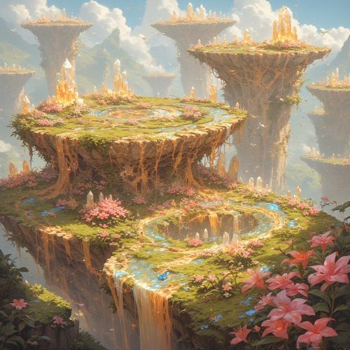 Anchored Skywhales remain semi-dormant beneath major terraces, their tendrils stabilizing floating platforms. Small Lumenfly swarms circle their dorsal crystals, enhancing natural illumination. Sunscale Drakes perch nearby, reflecting twin-sun light onto Prismorchid blooms, creating prismatic halos across platforms.