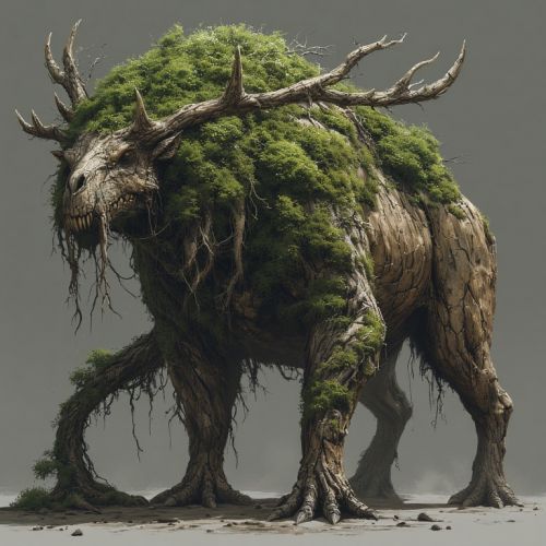 Size & Build: A massive herbivore averaging 2.3 m at the shoulder. Limbs thick but flexible; shoulders sloped to accommodate heavy antler-root structures. Hooves split into three prongs with textured pads for gripping vine-lattices and uneven forest floors. Hide & Camouflage: Bark-textured skin with natural striations mimicking tree grain. Color ranges from deep umber to mossy olive, with seasonal changes as antler moss adjusts to sunlight absorption. Thick hide resists abrasions from roots and thorny vegetation. Antlers & Symbiosis: Skull bears antler-like root extensions, heavily covered in fine symbiotic moss. Moss stores sunlight, providing slow nutrient release during lean months. Antler growth rings correspond to seasonal energy fluxes; shed naturally every few years. Head & Feeding: Broad, flat muzzle with strong incisors for stripping vine fruits and root crowns. Eyes set laterally for wide panoramic vision; ears small but sensitive to movement, able to detect approaching predators or disturbances along migration corridors.