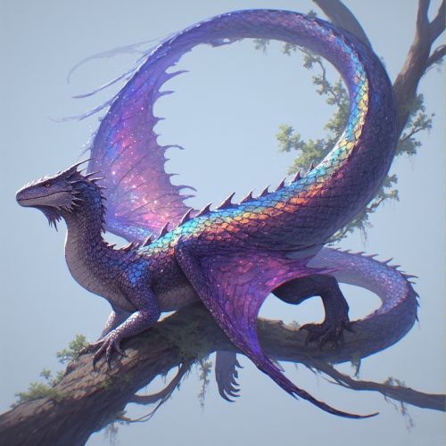 Size & Build: Adult length ranges 8-12 m, sinuous and muscular but not bulky. Ribs extended into flexible gliding fins that allow slow, controlled descents between canopy layers. Tail long and tapered for balance in wind corridors. Scales & Camouflage: Iridescent scales refract twin-sunlight, creating constantly shifting rainbow patterns across its body. Patterns shift dynamically depending on light angle and background foliage, giving near-perfect visual concealment in the canopy. Head & Senses: Broad, triangular head with slit pupils capable of detecting movement and heat across several meters. Nostrils and sensory pits along the jaw allow detection of subtle air currents, helping it track gliders or small mammals in motion. Habitat & Nesting: High-canopy nests constructed from tightly woven leaf bundles reinforced with crystal shards. Typically positioned along strong wind corridors to optimize ambush opportunities and gliding descents. Behavior & Diet: Ambush predator, feeding on Skyweaver's, juvenile ungulates, and occasional gliders. Sheds large coils of skin twice yearly; old scales are collected for durable weaving or ritual use. Juveniles are unusually curious, often trailing gliders or explorers for observation. Ecological Role: Apex arboreal predator, helping maintain canopy population balance and indirectly influencing migration and nesting patterns of smaller species. Cultural Significance: Wardens treat them as “sky-wardens,” symbols of patience and vigilance. Songs describe them as “bridges alive,” representing connection and stillness. Shed scales are used in wards for protection or ritual attire, symbolizing silent strength.