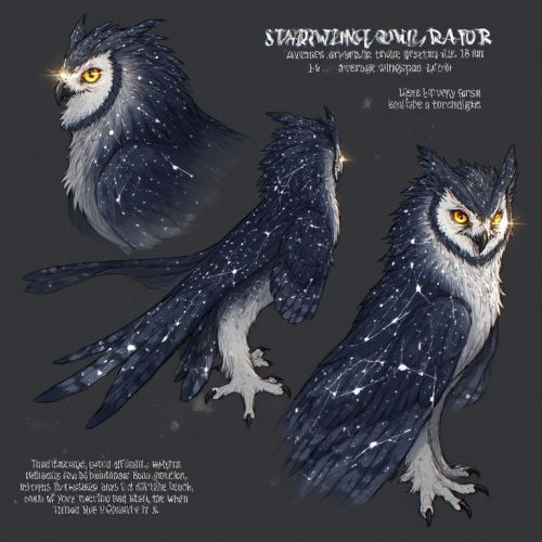 Size & Build: Wingspan ~1.8 m. Broad-chested, powerful wings designed for gliding along wind corridors and precise maneuvering in canopy spaces. Talons strong but elongated for gripping branches, rocky outcrops, and small prey. Plumage & Camouflage: Silver-white streaks across deep charcoal feathers form patterns reminiscent of constellations. The streaking creates natural disruption camouflage during low-light hunting. Head and back have slightly denser plumage for stealth and insulation. Eyes & Vision: Eyeshine produces golden flare under torchlight or twin-sun twilight. Acute low-light vision combined with sensitive motion detection makes them effective twilight hunters.