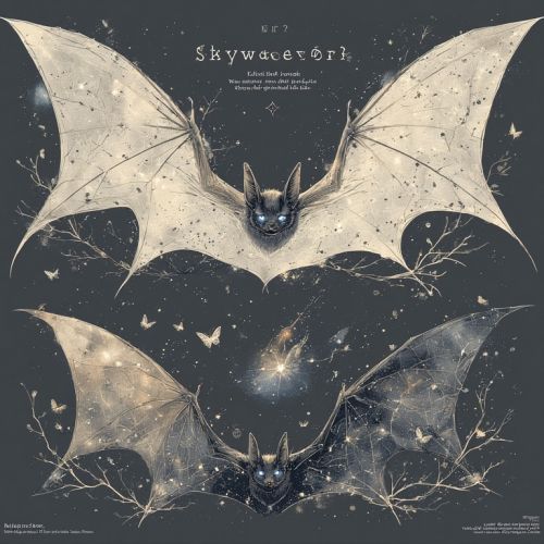 Size & Build: Wingspan ~1.2 m, body streamlined for agile nocturnal flight. Membranes are thin but reinforced with microscopic crystalline threads along wing bones and across joints, creating both structural strength and the refractive starlight effect. Wings & Coloration: Wing membranes are semi-translucent, patterned with naturally woven crystalline threads that refract ambient light. Trails of refracted light give the appearance of woven starlight when in flight. Faint blue glow from eyes provides limited self-illumination for navigation without alarming prey. Head & Senses: Elongated muzzle for nectar feeding and insect capture. Echolocation finely tuned for canopy topography. Eyes adapted to low-light vision; irises faintly phosphorescent to help colonies maintain cohesion in darkness.