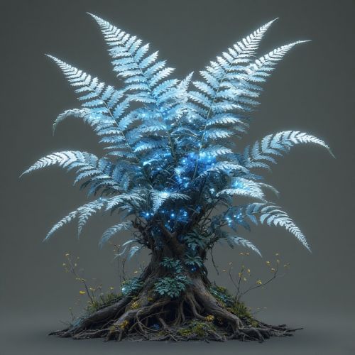 Size & Structure: Fronds range 0.5-1.2 m in height, with pinnate leaves that taper into delicate points. Stems are sturdy yet flexible, allowing them to sway with wind and support clustered fronds without toppling. Bioluminescence: Symbiotic photosynthetic algae embedded in fronds produce soft blue-white light. Intensity follows a circadian rhythm tuned to twin suns: strongest during low-light hours, faint during peak daylight. Light guides nocturnal pollinators and signals local energy flux in terraces. Roots & Soil Interaction: Shallow but widespread root network secretes mild nutrients, fertilizing surrounding plants and stabilizing terrace soil. Roots adapt to terraced architecture, expanding along ledges while avoiding dense moss beds. Behavior & Growth: Fronds respond to local light and energy conditions. Overgrowth can occur if energy flux is unusually high, leading to thick clusters that can overshadow other flora, a situation exacerbated by Rogue Bloom interference. Gentle manual pruning or ritual singing encourages fronds to grow in desired patterns. Ecological Role: Provides illumination and navigation cues for small pollinators, insects, and nocturnal animals. Nutrient secretion aids moss and low-lying plants. Acts as a living signal for Stewards monitoring terrace health.