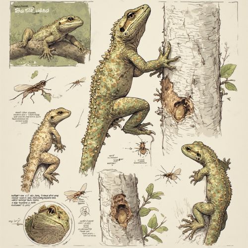 Size & Build: 30-50 cm in length, slender with a flattened body to cling closely to tree trunks and branches. Limbs are well-muscled for vertical climbing, ending in sharp, curved claws. Tail prehensile enough to stabilize on thin canopy platforms. Skin & Camouflage: Rough, bark-textured skin with subtle ridges and fissures. Capable of limited color shifts, mottled gray, brown, or mossy green, to match immediate surroundings. Texture breaks up silhouette, making it nearly invisible when stationary. Head & Feeding: Short, triangular head with quick, flicking tongue for snatching small insects. Eyes positioned for good lateral and forward vision, enabling detection of predators and prey across branches. Habitat: Tree trunks, canopy branches, and platforms within the Canopy Metropolis. Prefers areas with moderate sunlight and nearby moisture to sustain insect prey. Behavior: Diurnal, moving slowly along trunks and canopy platforms. Feeds on insect pests that threaten Glowferns and moss beds, acting as a natural “garden assistant.” Uses color-shifting camouflage to evade predators or surprise prey. Cultural Significance: Observed during canopy festivals and daily stewardship patrols. Considered a helpful companion by Stewards, earning it the nickname “garden assistant.” Ecological Role: Controls insect populations, indirectly maintaining moss terraces and Glowfern health. Camouflage allows coexistence with larger arboreal predators.