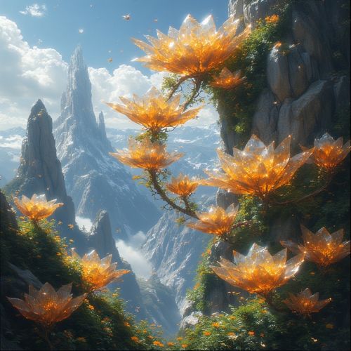 Ecological Appendix II - Central HighlandsA Chapter by HaleyBSolarvine (Vitis solaria)Classification: Sun-harvesting climbing plant. Morphology: Robust vine with broad, translucent leaves interlaced with crystalline filaments that act as photosynthetic prisms. Each leaf adjusts its angle throughout the day to follow the path of the twin suns. Mature tendrils develop mineralized hooks to secure themselves to quartz outcrops, terrace walls, or urban spire structures. Habitat: Prefers high-exposure regions, mountain slopes, highland terraces, and Crystalspire peripheries, where twin-sunlight is most abundant. Thrives particularly on quartz-rich surfaces where resonance and light converge. Behavior & Ecology: Absorbs and stores solar energy during the day; releases it as faint warmth and low-level illumination through its leaf-crystals at night. Root systems enrich soil by excreting trace minerals, fostering companion plant growth. Pollinated by Lumin's and certain canopy-dwelling beetles. Cultural Significance: Forms the living backbone of many highland energy networks, powering lanterns, heating arrays, and ceremonial glow-paths during festivals. Pruned shoots are woven into ritual braids during the Solar Concord rites, symbolizing continuity and shared vitality. Interactions: Heavily cultivated but strictly monitored, overharvesting or improper pruning can disrupt its energy release cycle. Notes: Prolonged exposure to Bloom energy can cause uncontrolled vine proliferation, sometimes engulfing entire terraces. Sages deploy harmonic pruning techniques to prevent runaway growth near resonance zones.