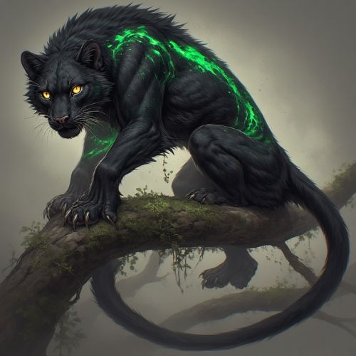 Ecological Appendix II - Northern ForestsA Chapter by HaleyBShadowfang (Panthera umbrae)Size & Build: Large, muscular feline built for stealth and agility in the upper canopy. Body length 1.8-2.2 m, tail long and flexible for balance across branches. Limbs are lean but strong, capable of gliding between branches in short leaps. Fur & Markings: Jet-black fur with faint reflective streaks along flanks and shoulders. These subtle markings catch dim canopy light, breaking up its outline for near-invisibility at night. Fur is short but dense, reducing noise during movement. Claws & Senses: Retractable claws sharp and curved for gripping branches silently. Highly sensitive whiskers detect branch vibrations; acute low-light vision allows hunting during twilight and night. Habitat: Upper canopy layers and dense glades of the Northern Forest. Prefers shadowed regions with complex branch networks. Behavior & Hunting: Nocturnal apex predator. Hunts Glade Striders and smaller arboreal fauna, stalking silently through shadowed glades and canopy layers. Moves methodically, often using elevated vantage points for ambush. Cultural Significance: Feared yet protected by Canopy Wardens. Sightings logged carefully; shifts in movement patterns serve as ecological indicators, including Bloom spread or herbivore scarcity. Ecological Role: Maintains herbivore populations, influencing migration and grazing patterns. Population density correlates with forest health; their presence signals a balanced ecosystem.