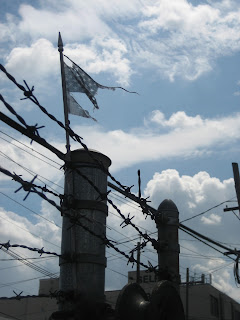 mired in the dirt, tilted, at a peculiar angle, a dangerous tipping point. The blest banner surrounded by a garden of garbage planted by motorists flinging away wrappers from a throwaway society. The flags hem is loose flapping on its own. Alone, holding onto a stubborn corner. Gotta be, Betsy Ross's best stitch; hoping the hem holds, or it all falls apart. Where is Francis Scott? No doubt singing a reverie off key to this sacred banner at a Magic game in Orlando. But today I only hear dirges. Rally round the flag boys. Old Abe kept the stars intact with the blood of 600,000. Our Federal constellation now endangered of falling apart again; badly in need of rearrangement. Maybe if we added Puerto Rico Guam and DC we could keep everybody interested. A sure sign of imperial progress. Hell, for that matter lets add Canada, Mexico and Chile. American's need to think big. The original 13 stripes run together like pink puke our founding Revolutionists Sam Adams and Tommy Paine expunged while drunk on Boston Pale Ale. The white, a promise of purity is a cum stain on a paramours dress lying on floor of the White House Green Room. The red remains true. More bloodshed will flow much more bloodshed. Kids go to school and blow away fellow students; and the best teachers lay down their lives trying to shield their young charges. Or Uzi’s singing like a deathly nightingale in urban projects. Or a mother brutalized to death by her husband who just got reorged out of a $100,000 job. I sit and stitch with invisible thread. Putting patches together of a nation I once knew; or thought I knew I sew longer and faster, the quilted pastiche of America; trying to lash together the fabric of this nation. On top of old Smoky, an on the lam Randolph disappears into a mountaintops foggy mist; to some Right to Lifers an American hero; to others a mad bomber terrorizing citizens and murdering innocents. A Gay boy in Wyoming is strung up with barbed wire, he is crucified like Christ. Jesus’ wounds run with fresh blood, salved in fresh vinegar again. Black rappers call themselves Niggaz with an attitude. Malcolm X asks why and WEB Dubois sings Ole Man River with Paul Robeson; as a public official resigns because he used the word niggardly. AIDS continues its tireless global creep; while fundamentalist’s paint goats blood on the doorjambs and wait for the Passover of a saintly rapture. William Jefferson is impeached and Senators jerkoff over the centerfold of the Starr Report; while Tomahawks scalp Baghdad, Serbs cleanse Europe, and Red China waits in earnest, attempting eco-suicide. In Texas and California the INS builds a great wall to keep Mexicans out. They don’t want the whole enchilada; all they want is a job at Taco Bell and a chance for a bite of the Big Burrito. A little salsa might be exactly what this old flag needs. I sit and stitch the fabric of the nation; mired in a blue field, thinking of Betsy Ross, wondering if she was a good lay? You Tube Music Video: Gil Scott Heron, Winter In America jbm Paterson 11/98 © 2012 riskrapperAuthor's Note